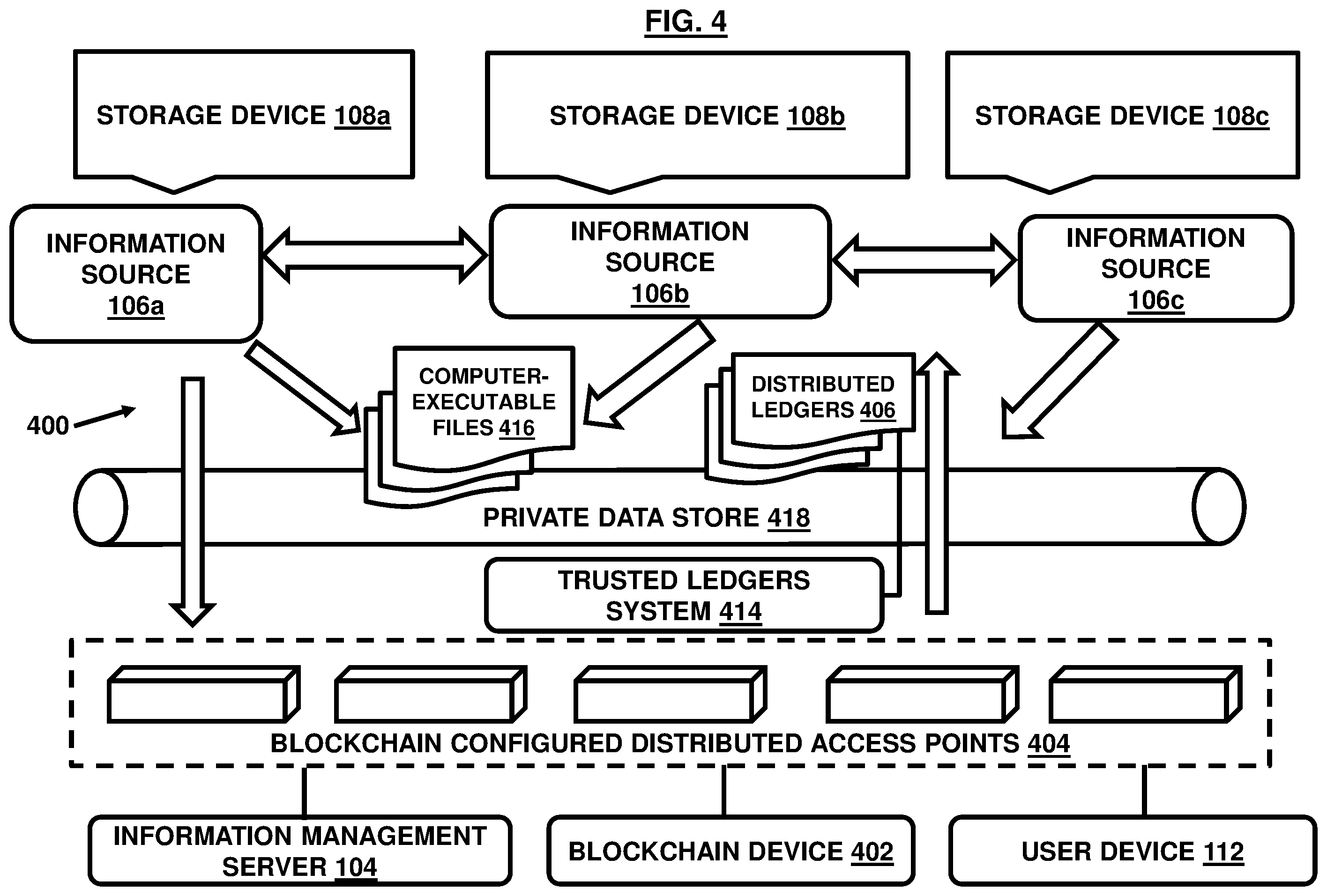 The blockchain-configured ecosystem architecture 400 may provide a private view for the various devices and the entities operating in the network through the private data store 418 so that each permissioned device such as the information management server 104 may privately access the computer-executable files 416 associated with a task based on various policies such as based on their respective identities. The information management server 104 may access the computer-executable files 416 through the dedicated private data store 418 available through the plurality of distributed blockchain-configured access points 404, which may be enabled in the form of distributed blocks as shown in FIG. 4, with each block providing the ability to access the features of the blockchain-configured ecosystem architecture 400 by different terminals and devices at the same time based on defined and granted access rights.