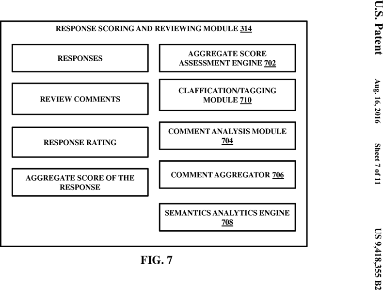 In some embodiments, the response scoring module 314 includes a response aggregate score assessment engine 702 , comment analysis module 704 , comment aggregator 706 , semantics and analytics engine 708 , and response classification/tagging module 710.