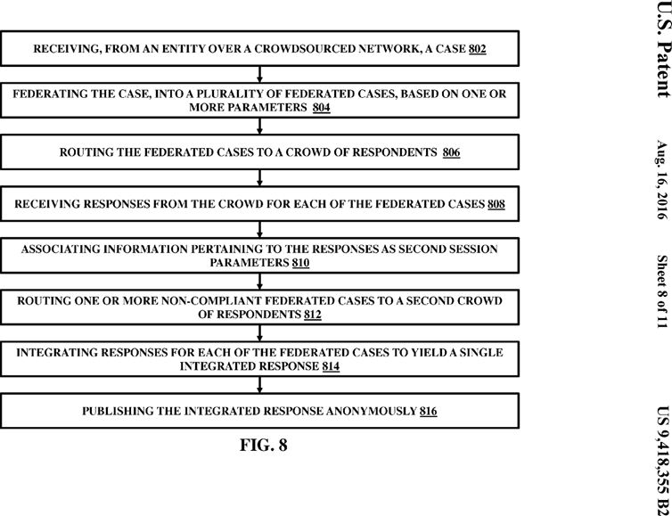 FIG. 8, with reference to FIGS. 1 through 7, illustrates a method flowchart for management of responses to cases submitted by a plurality of entities 102 in the crowdsourced network 106. The method includes receiving, from an entity over the crowdsourced network, a medical case at step 802. At step 804 , the method further includes federating the medical case, into a plurality of federated cases, based on one or more parameters including a level of complexity, technology involved, and a level of reliability and trust desired in its respective response. Each of the federated cases are associated with one or more corresponding first session parameters that are indicative of a respective level of complexity, technology involved, a level of reliability and trust in response desired. The method includes, at step 806 , routing the federated medical cases to the crowd of respondents 104 in the network 106 such that the routing of the medical cases is managed based on the first session parameters associated with each of the federated medical parameters. The method includes receiving responses from the crowd for each of the federated medical cases at step 808. At step 810 , the method includes associating information pertaining to the responses as second session parameters that is compared with the first session parameters such that the comparison yields a degree of compliance and appropriateness of the second session parameters toward the first session parameters. In response to a degree of compliance below a threshold for one or more federated medical cases, an adjusted set of third session parameters are associated with the one or more such federated medical cases. At step 812 , the method includes routing the one or more such non-compliant federated medical cases to a second crowd of respondents 104 in the network 106 such that the routing of the medical cases is managed based on the third session parameters associated with each of the one or more federated medical parameters. At step 814 , the method includes integrating responses for each of the federated medical cases to yield a single integrated response for the medical case corresponding to the federated medical cases. At step 816 , the method then includes publishing the integrated response anonymously that is viewable publicly.