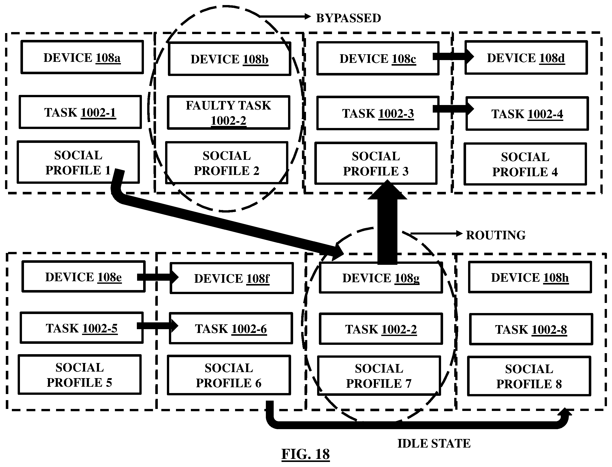 sharing a social content, indicative of the fault and a predicted modified event occurrence time at the first device, to a social networking platform through a two-way communication channel including a near field communication channel and a socially aware network channel, wherein the social networking platform sends the social content to the second device, and wherein the first device and the second device comprise connections and parts of a same chain of integrated tasks. Example 99. The non-transitory program storage device of Example 98, wherein the social content is exchanged through a social activity which is initiated after the first device and the second device are mutual connections.