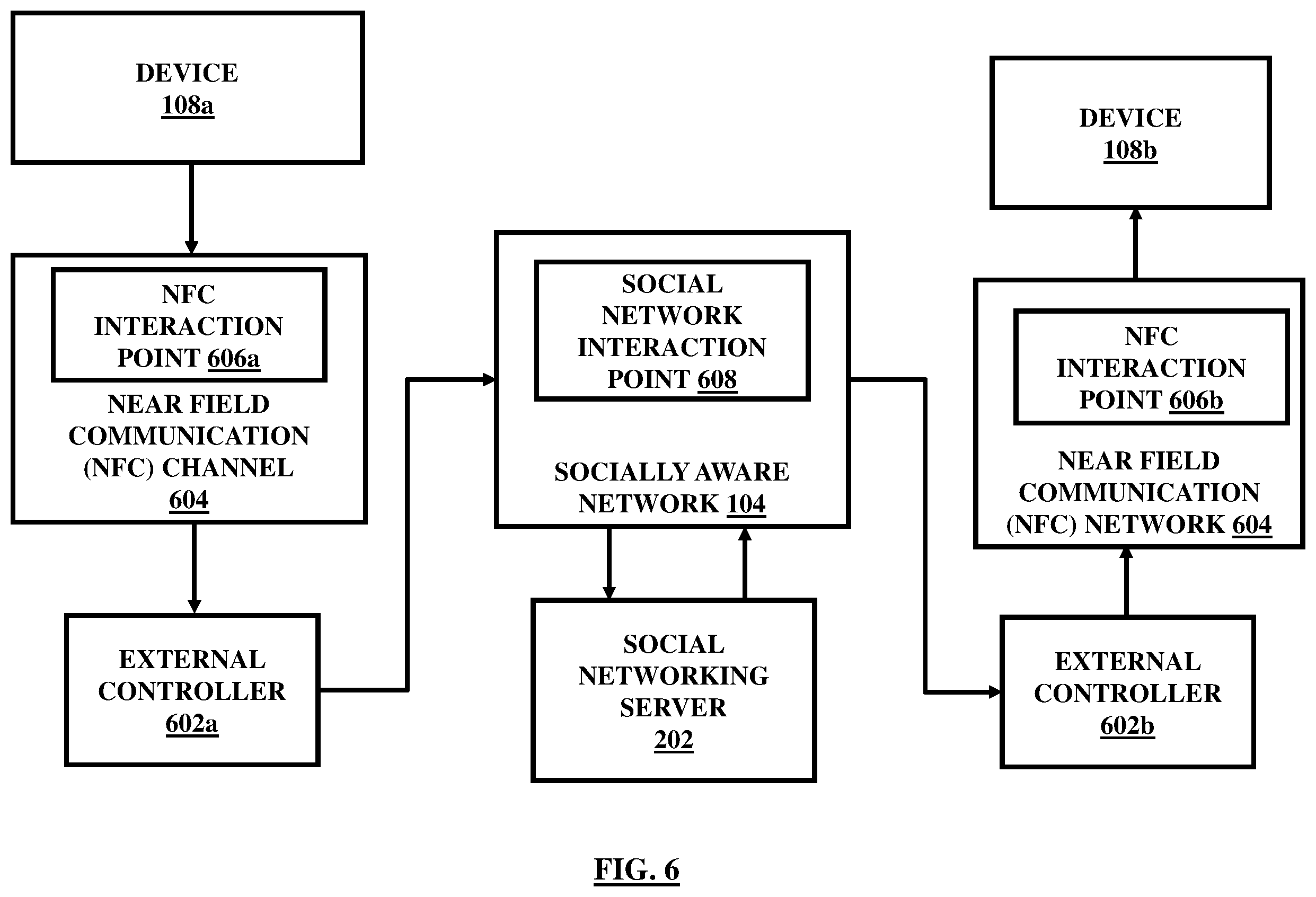FIG. 6 illustrates a communication network for exchange of social content between devices in accordance with an embodiment herein;